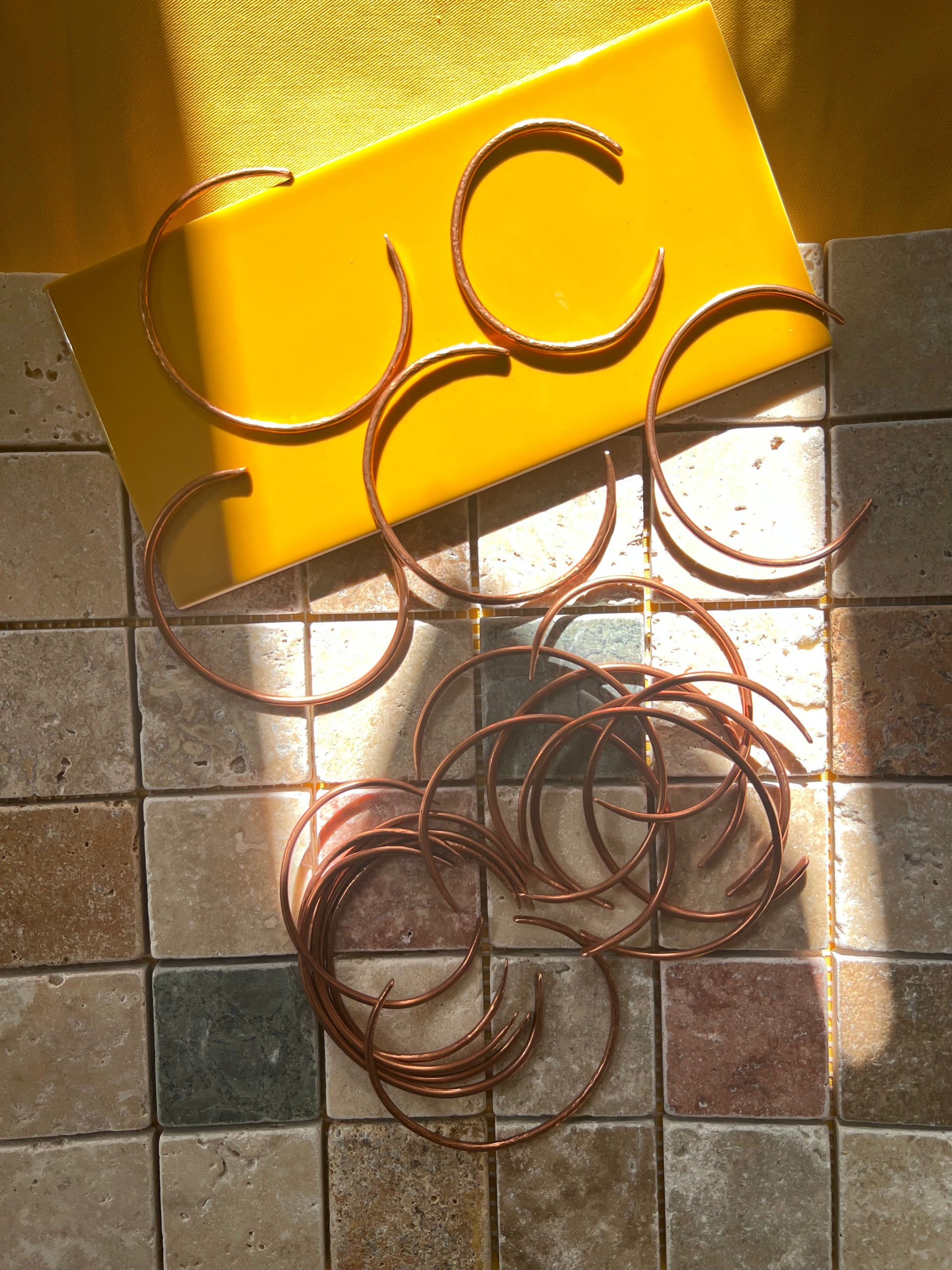 Handcrafted bracelet using raw copper wire, hammered flat on the ends and adjustable to fit wrist.